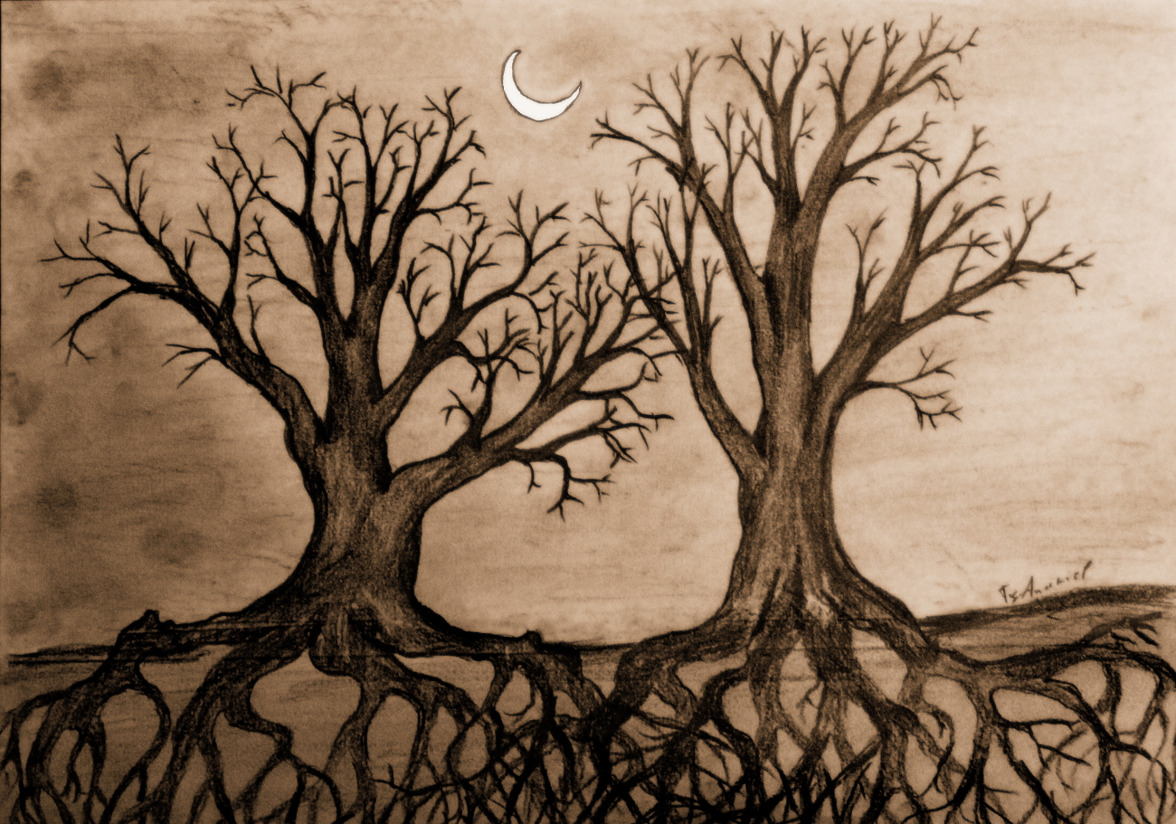Weitere Jahrzeiten vergehen, die Zeit nagt weiter, hinterlässt ihre Spuren auf allem was ist. Die Höhlung in meinem Stamm, in der einst Singvögel brüteten ist nunmehr groß genug um einer Eule Platz zu bieten. Sie bleibt nun schon den dritten Sommer. Doch nun naht der Herbst, wir lassen unsere Blätter fallen. Die ersten Stürme toben über das Land und ich, ich muss mich nun immer öfter an dich lehnen. Doch meine Wurzeln sind noch immer stark und mittlerweile so gänzlich mit den deinen verflochten, so dass sie sich nicht mehr wirklich trennen lassen. Nun entspringen wir doch den selben Wurzelgeflecht.