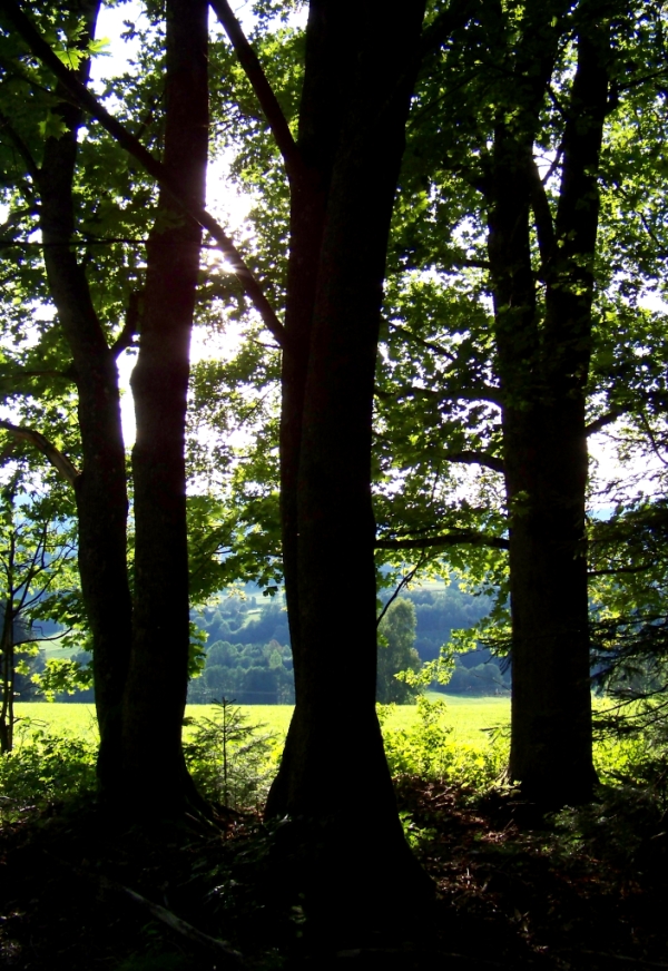 Das bronzefarbene Licht fließt wie Wasser durch die Wipfel und an den Stämmen vorbei um helle Flecken zu erschaffen, die gleich Teichen sind aus flüssigem Licht. Daneben wirken die Schatten tiefer, dunkler, als sie eigentlich sind.