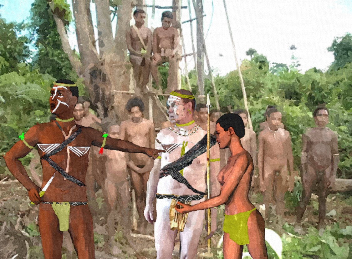 Die vier Eingeborenen, die sich am Strand hingehockt hatten, standen auf und kamen auf Paul zu. Sie zerrten ihn hoch, dann banden sie ihm die Hände hinter dem Rücken zusammen und forderten ihn auf zu gehen. Paul humpelte mühsam durch den Dschungel, immer wieder bekam er die Spitze eines Speers zu spüren, wenn es den Eingeborenen zu langsam ging. Oft fiel er hin und wurde wieder roh hoch gezerrt.