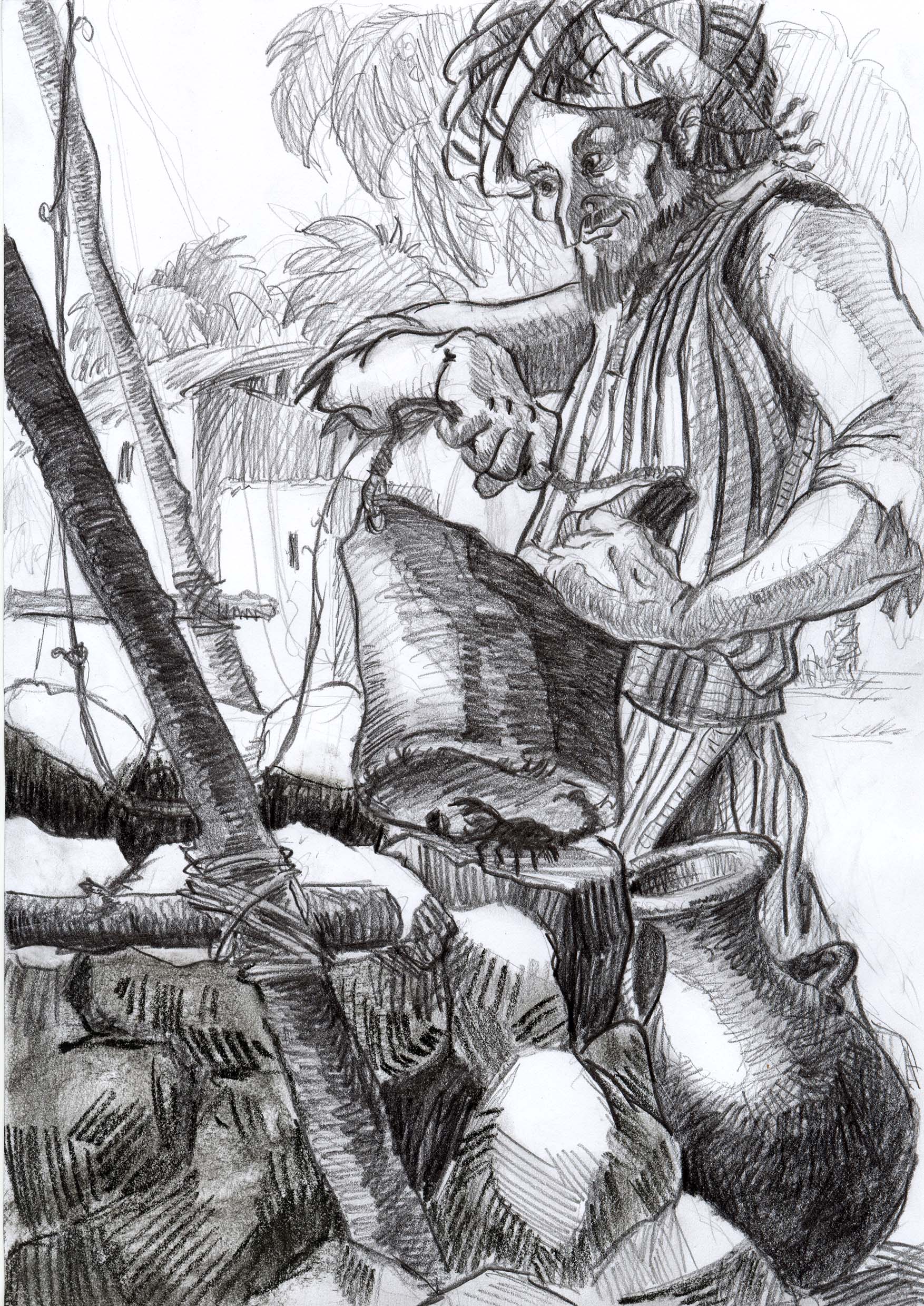 „Aber es fallen doch genügend auf seine üblen Machenschaften herein!“, verbiss sie sich in ihren Gedanken und spann sie stolz weiter: „Hast du nicht begriffen? Jetzt sind wir einmal dran, den Reibach zu machen! Für uns! Verstehst du, für uns allein! Omar, das ist unsere Chance endlich eine zweite Ziege zu bekommen oder vielleicht sogar einen Ochsen! Das wäre doch gelacht, wenn uns das nicht gelingen würde! Wir wissen, dass dieser Stich (Allah möge uns beistehen) nicht tödlich sein wird! Du musst einfach nur so tun, als ob du mit dem Tode ringst! Also nur laut genug schreien, dich zu unserer Hütte schleppen und auf unser Lager werfen! Glaub mir, du wirst sehen, wie sehr das Hassan Ibn Odd Set imponieren und wie sehr er uns bei unserem kleinen Trick helfen wird! Weil er dann glaubt, sich damit selbst am meisten zu helfen!“