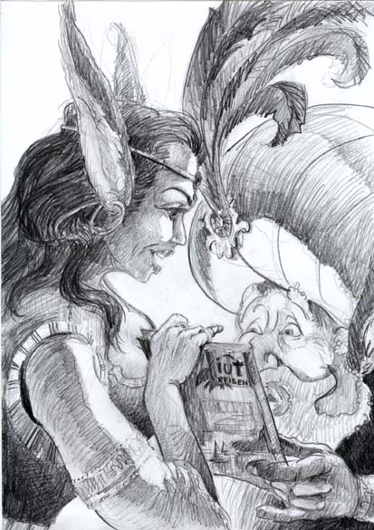 „Oh, ja“, die Prinzessin hatte sich gefangen und schaute ihn mit einem strahlenden Lachen an, „ich besitze seit kurzem einen Flaschengeist! Den habe ich beauftragt, einen Arzt herbeizuschaffen, der uns die Eselsohren beseitigen kann! Bist du etwa neuerdings Arzt?“