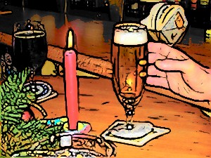 Bevor die Bedienung das Bier zapfte, zündete sie mit einem Feuerzeug die rote Kerze an und sagte, na denn, frohe Weihnachten! Danke, Ihnen auch! sagte Jörg. Dann blickte er von der brennenden Kerze mit dem Tannengrün zu den Tanzenden. Dieses Tränendrüsenfest sollte man aus dem Kalender streichen, überlegte er, aber egal, die Leutchen finden immer einen Grund zum Feiern und Weihnachten ist so gut wie Karneval oder sonst ein Anlass. Die Kellnerin sagte, das ‚Sie’ kannst du hier ruhig weglassen, mit sympathischen Gästen bin ich per Du, also, ich bin Anita! Sie hielt ihm die Hand hin.