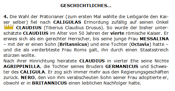 „Claudius hat sich vor einem Monat von der Messalina scheiden lassen. Und jetzt wissen wir auch warum: Sie hat ihm erzählt, dass der Barbillus ihr vorhersagte, ihr Ehemann, also der Kaiser würde sterben. Guter Witz, was?“ Terehasa schlug sich auf die üppigen Schenkel.
