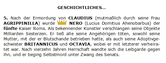Und jetzt sollte ihre Urenkelin Agrippinilla die neue Kaiserin werden? Das Schlimme daran war ihr Sohn Lucius Domitius, dieser eitle Geck, dieser frisierte Schauspieler, dieser miese Sänger. Erzogen von Seneca, dem die Meinung des Volkes nichts bedeutete. Sein Vater stammte aus der gleichen Familie, aus der auch die Messalina kam, welch verheerende Kombination aus Domitiern und Claudiern – beide waren gleichermaßen durchsetzt mit grausamen und sadistischen Charakteren. Lucius Domitius schleimte sich jetzt schon beim Volk ein, genauso wie sein Onkel Caligula damals. Anscheinend war er damit erfolgreich. Welch dummes Volk!