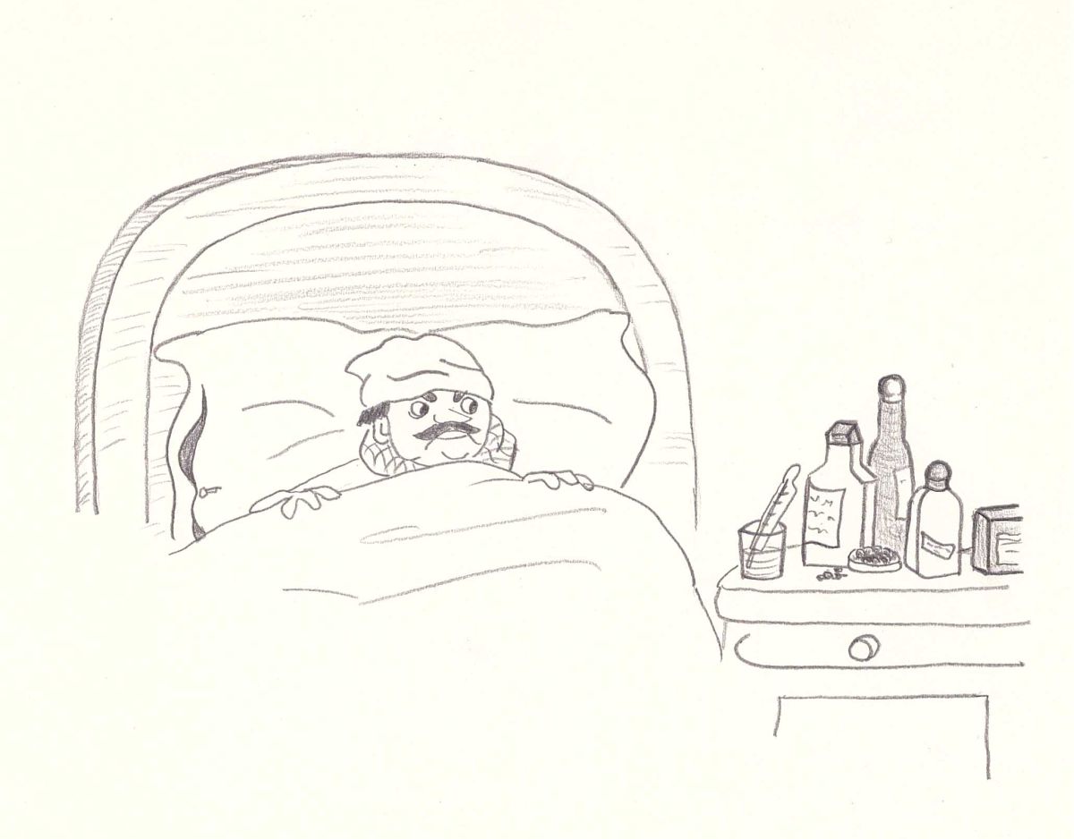 Am anderen Tag war der Bürgermeinster krank. Er hatte eine schwere Erkältung und musste im Bett liegen. Seine besorgte Frau, die Bürgermeisterin, ließ gleich den Arzt kommen. Dieser verordnete, dass der Patient eine Schwitzkur machen sollte. So lag der arme Bürgermeister mit einem dicken Schal um den Hals und einer Wollmütze auf dem Kopf in einem warmen Federbett und schwitzte wie ein Eisbär in Afrika. Starker Durst quälte ihn.